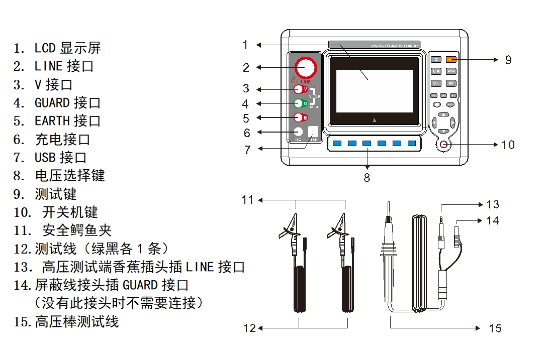 | 測試線 | 高壓棒紅色3米,高壓測試線黑色 1.5 米,綠線 1.5 米 |