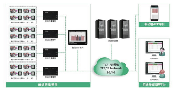采用先進的分布式一拖一組網模式:每個單體電池安裝一個控 模塊,每個監控模塊通過RS485網線串接起來。監控數據匯集 到組端收斂模塊,再由收斂模塊將數據傳輸到顯示模塊顯示。 這種方式安裝簡單方便,同時售后維護也極其便捷。